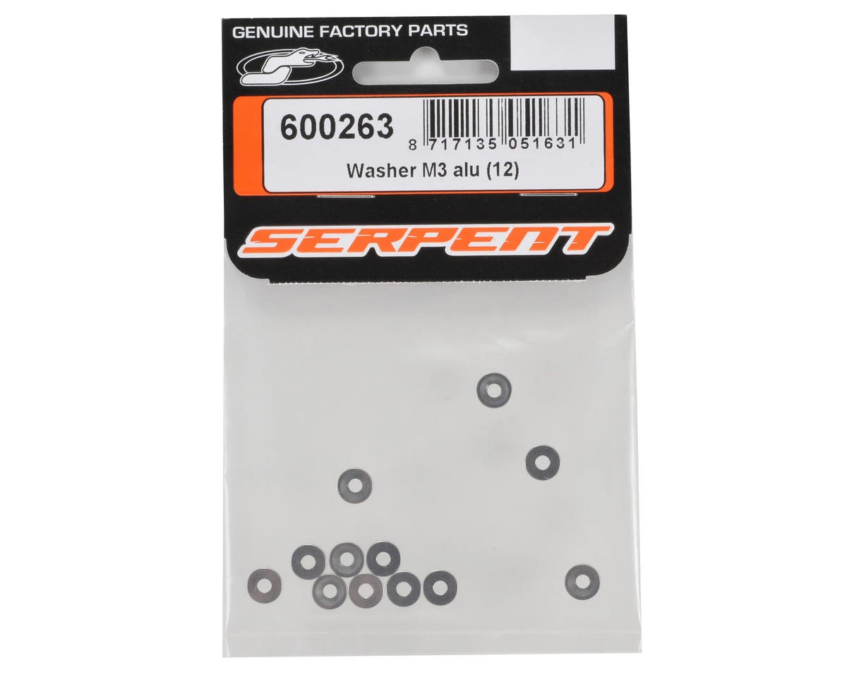 This is a set of twelve replacement Serpent 3mm Aluminum Countersink Washers, and are intended for use with the Serpent S811 Cobra.
