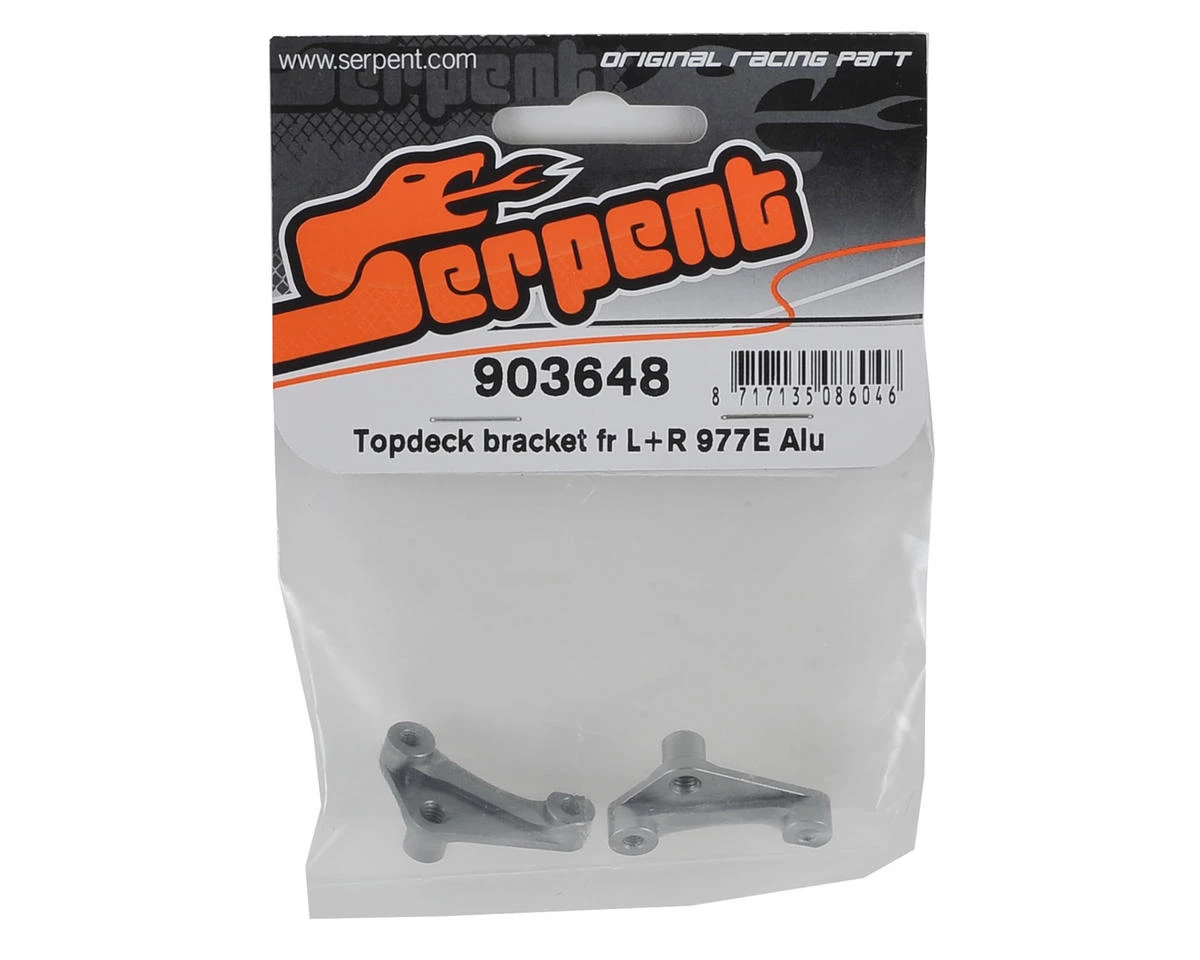 This is a pack of two optional Serpent Aluminum Front Top Deck Brackets for the 977-e. These brackets are substantially stronger and rigid compared to the standard plastic brackets (SER904119).