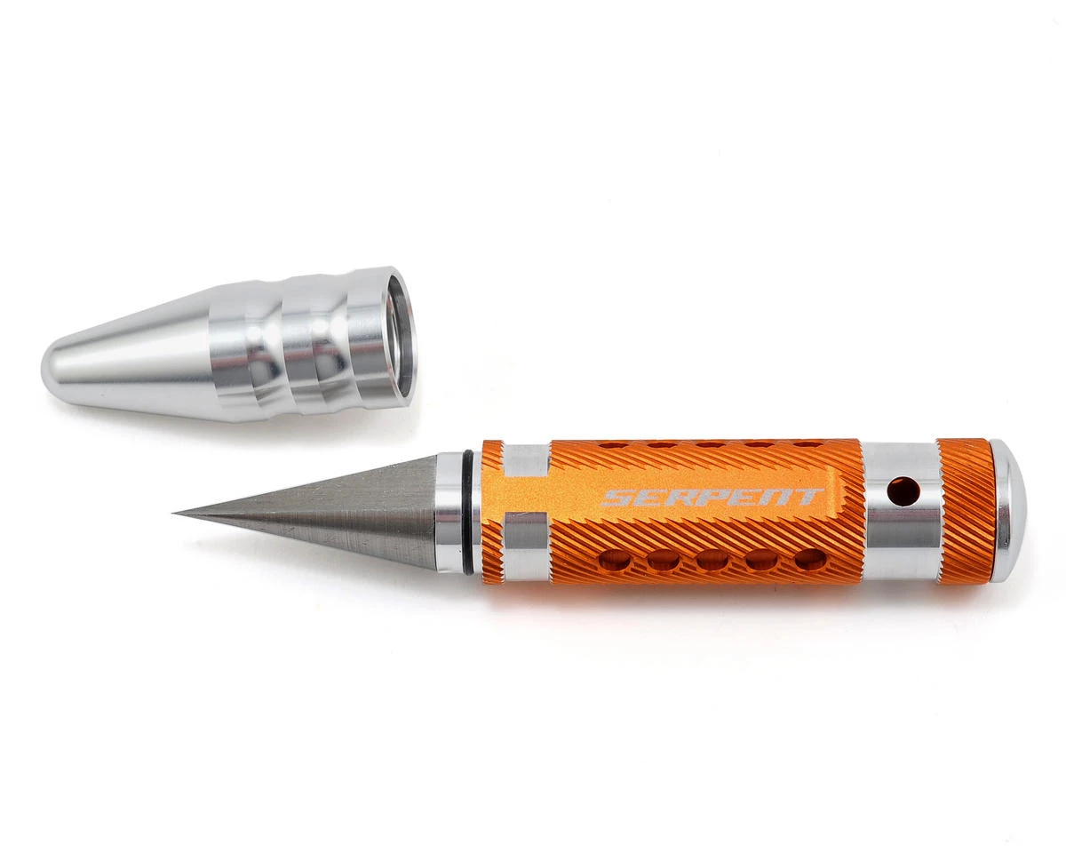 This is a Serpent Body Reamer. Serpent tools feature a lightweight machined aluminum handle and an engraved Serpent logo, combined with precision machined steel tips. The shape of the handle prevents the tool from rolling off the work bench and the size of the tip is engraved in the handle for easy identification. This body reamer features a double edged cutting head, that displays millimeter increments up to 16mm.