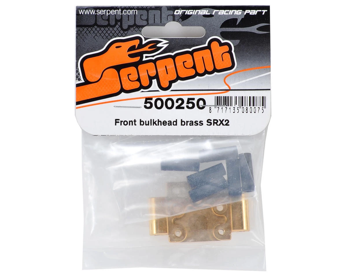 This is an optional Serpent Brass Front Bulkhead. This brass bulkhead includes 20°, 25° and 30° composite inserts to change the overall caster angle of the front wheels, allowing the user to fine-tune the steering characteristics of the buggy. Plus, the heavier weight of the bulkhead allows the user to tune the weight distribution of the car. Package includes a brass bulkhead and six bulkhead inserts.