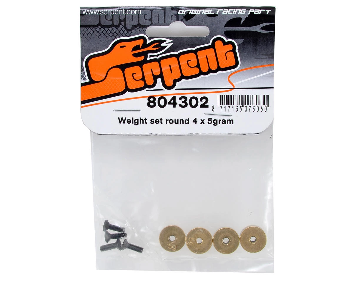 This is an optional Serpent Brass Round Chassis Weight Set. Package includes four 5g weights, and mounting hardware.