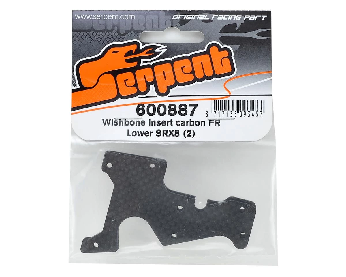 This is a pack of two optional Serpent Carbon SRX8 Front Lower Wishbone Inserts. These carbon inserts attach to the front lower arms to aid in rigidity for high-traction or high-temperature applications.