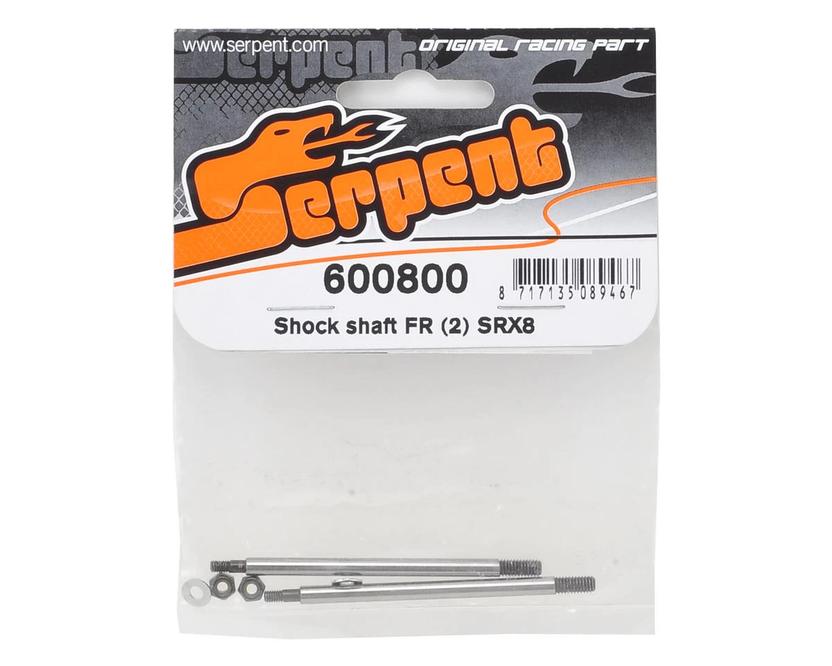 Serpent SRX8 Front Shock Shaft. These are the stock replacement shock shafts. Package includes two shock shafts, two washers and two lock nuts.