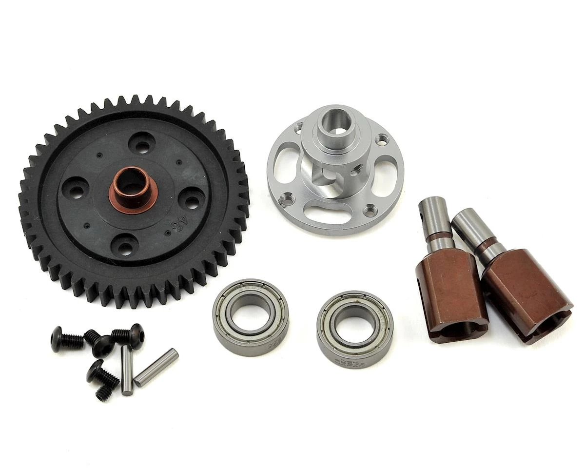 The center solid shaft system fits all current center gears. The set comes with the regular lightened spring steel adapters and the center adapter in coated 7075 T6 aluminum, completed with the 48T composite gear and 2 top quality NSK bearings and hardware.