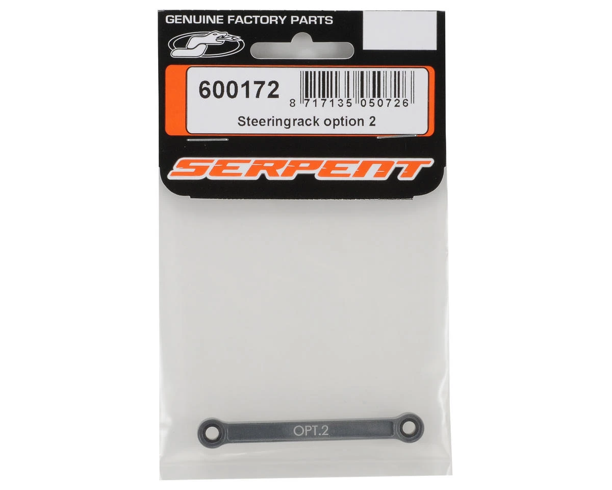 This is an optional Serpent “Option 2” Steering Rack, and is intendedfor use with the Serpent S811 Cobra 1/8 buggy. The design of thesteering rack allows the Ackerman to be changed without adjusting thesteering links. The only thing that needs to be adjusted are thesteering servo end points.