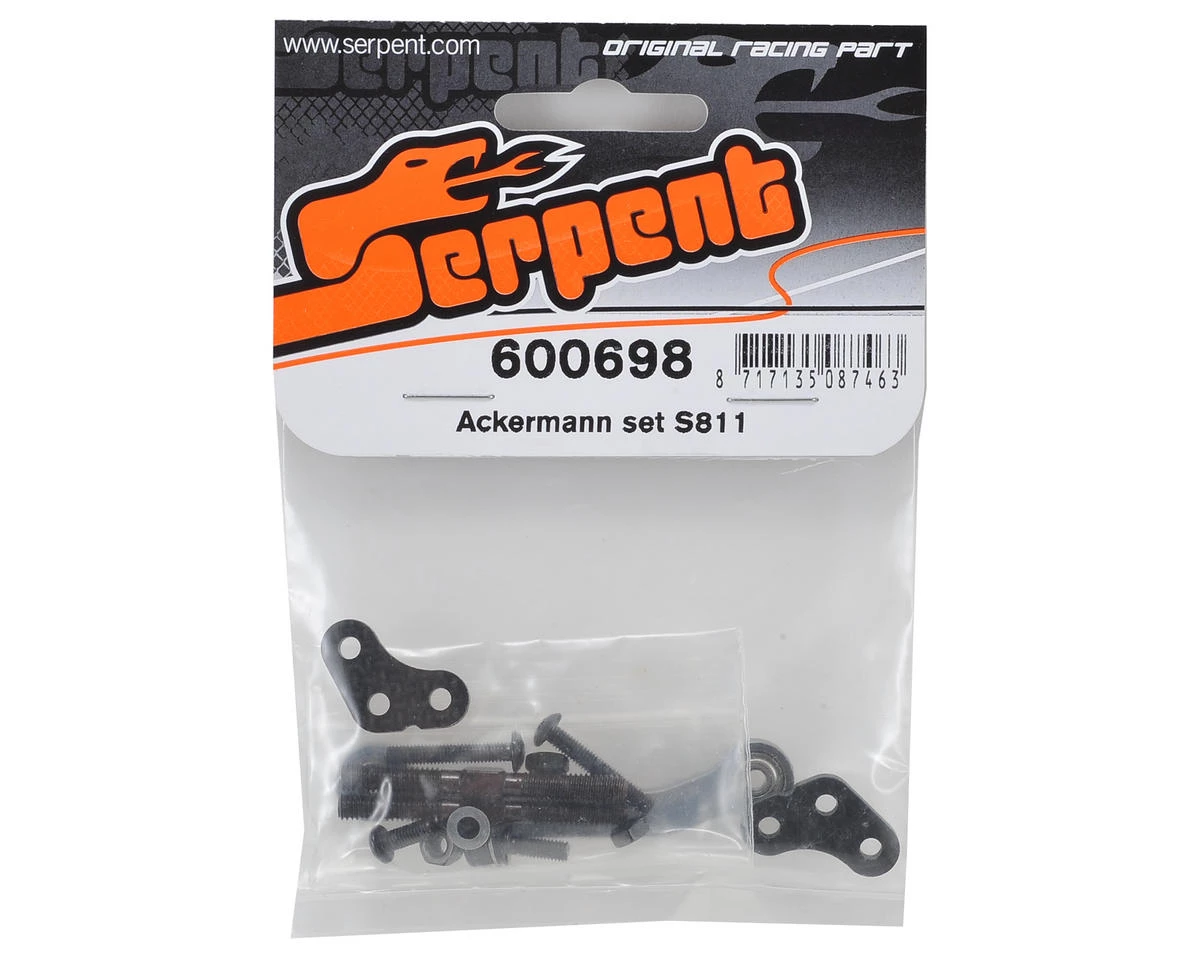 Serpent S811 Ackermann Set. This optional ackermann provides a more direct steering feel for your S811 based chassis. This set features a machined aluminum bar with pressed in bearings, as well as carbon fiber ackermann plates that are used in combination with shorter steering links. Package includes all the hardware needed for installation.