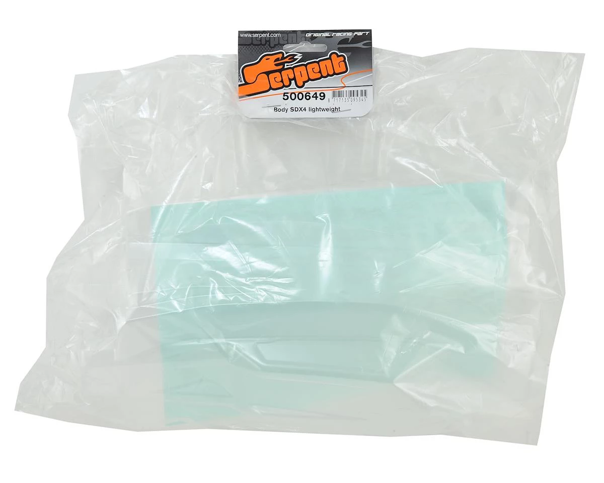 This is the Serpent Clear Lightweight Body for the SDX4. This body requires polycarbonate painting and trimming, but includes a decal and window mask sheet.