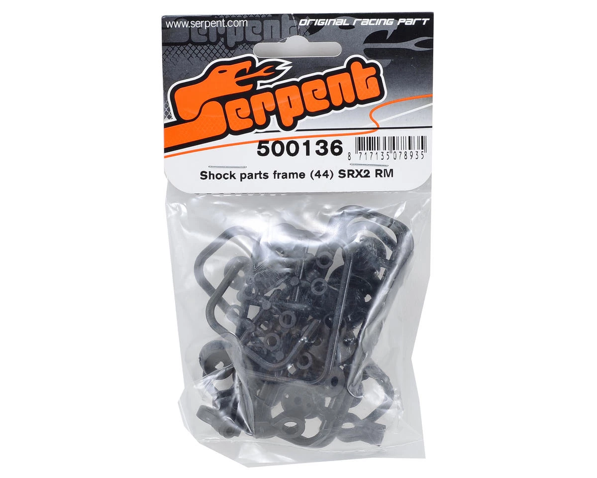 This is a replacement Serpent Shock Parts Frame. Package includes plastic spring cups, shock shaft rod ends, lower shock caps, pistons, pivot balls and shaft guides.