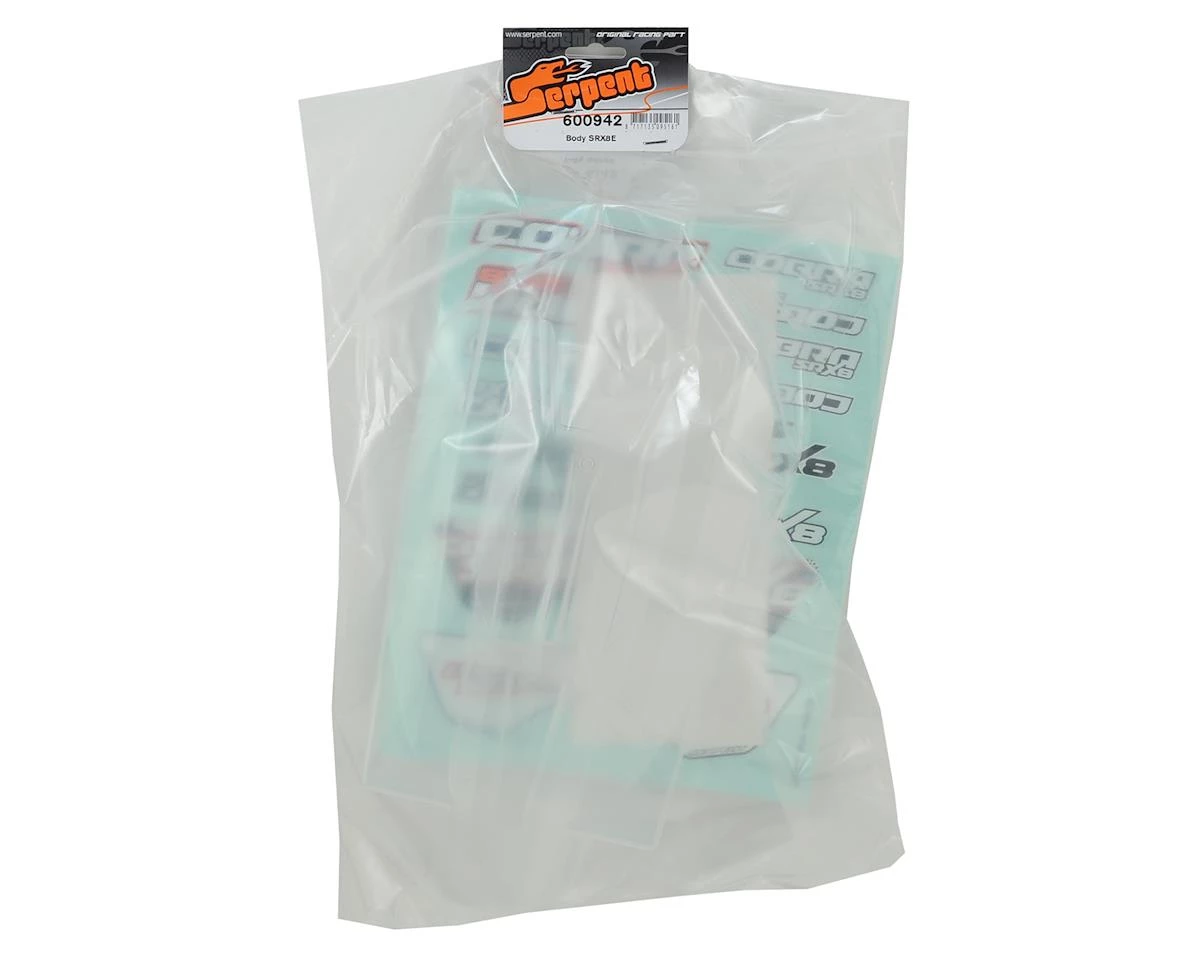 This is a replacement Serpent Clear SRX8-E 1/8 Buggy Body. This body includes window masks and decals, but requires polycarbonate paint.