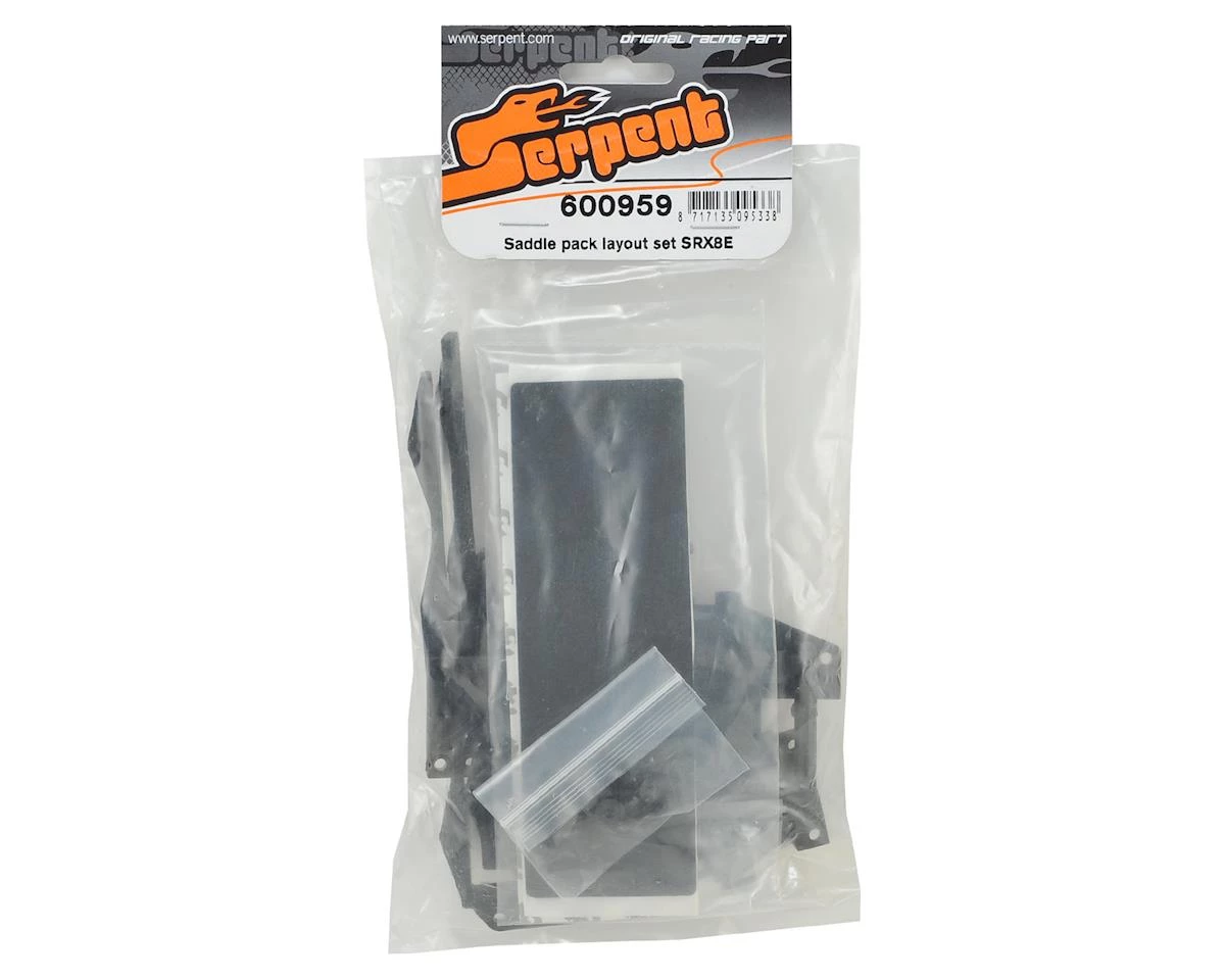 This is the optional Serpent SRX8-E Saddle Pack Layout Set. This kit allows you to use saddle packs in the chassis for an alternate weight bias layout.