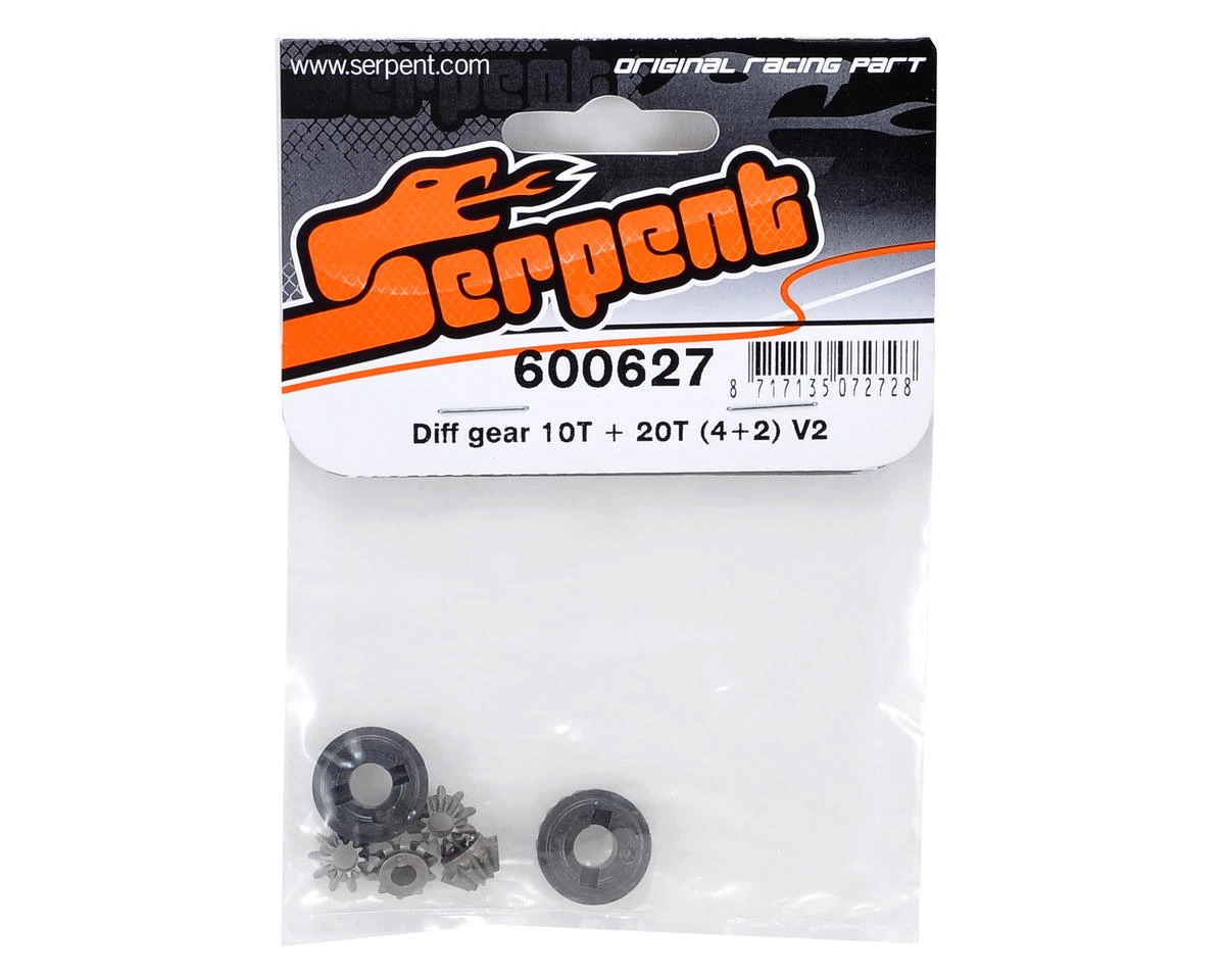 This is an optional Serpent V2 Differential Gear Set, and is intended for use with the Serpent 811 line of 1/8 scale vehicles. This gear set is an updated set making differential action smoother with an improved gear mesh and tooth shape. This updated design no longer uses the backing shim on the 10 tooth spider gears used on the original differentials. This makes assembly and maintenance easier with less parts to work with.