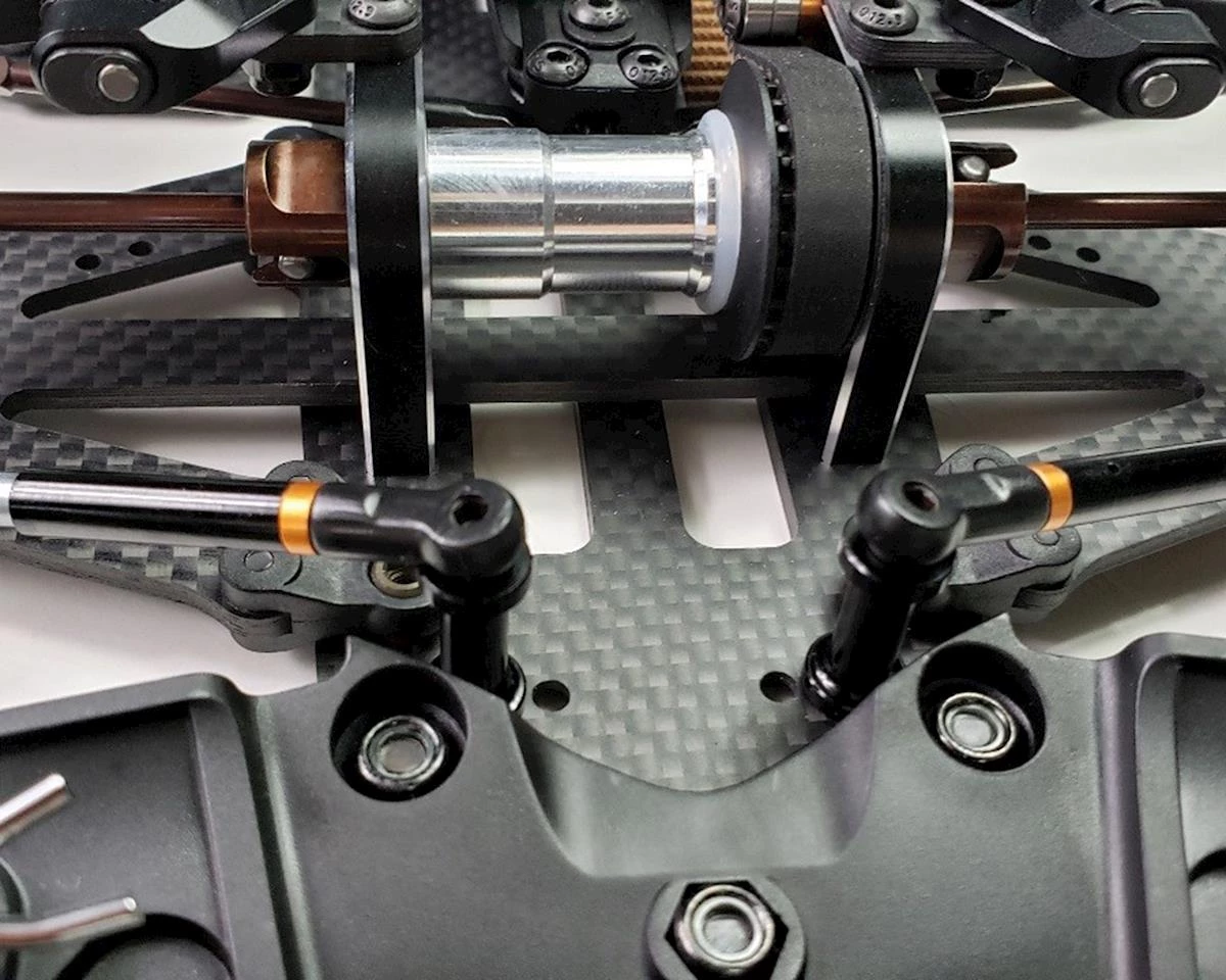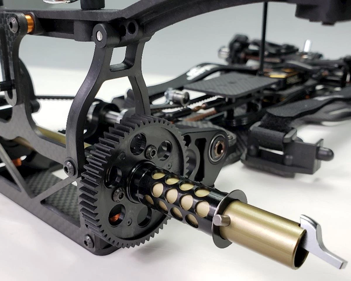 Ultra-true, low-friction mid shaft assembly, featuring 2 big-size ball bearings. The assembly is easy to remove for spur gear changes and general maintenance.