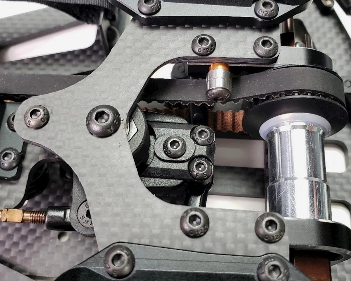 The rear end construction with aluminium brackets is a very open design, which allows for easy of maintenance and cleaning. Dis-assembly requires the removal of only a few screws. Replacing a belt if needed, is a simple task. The eccentric bearing holders on the rear shaft allow adjustment of belt tension. The whole rear end can be removed as one unit from the chassis by removal of only a few screws.