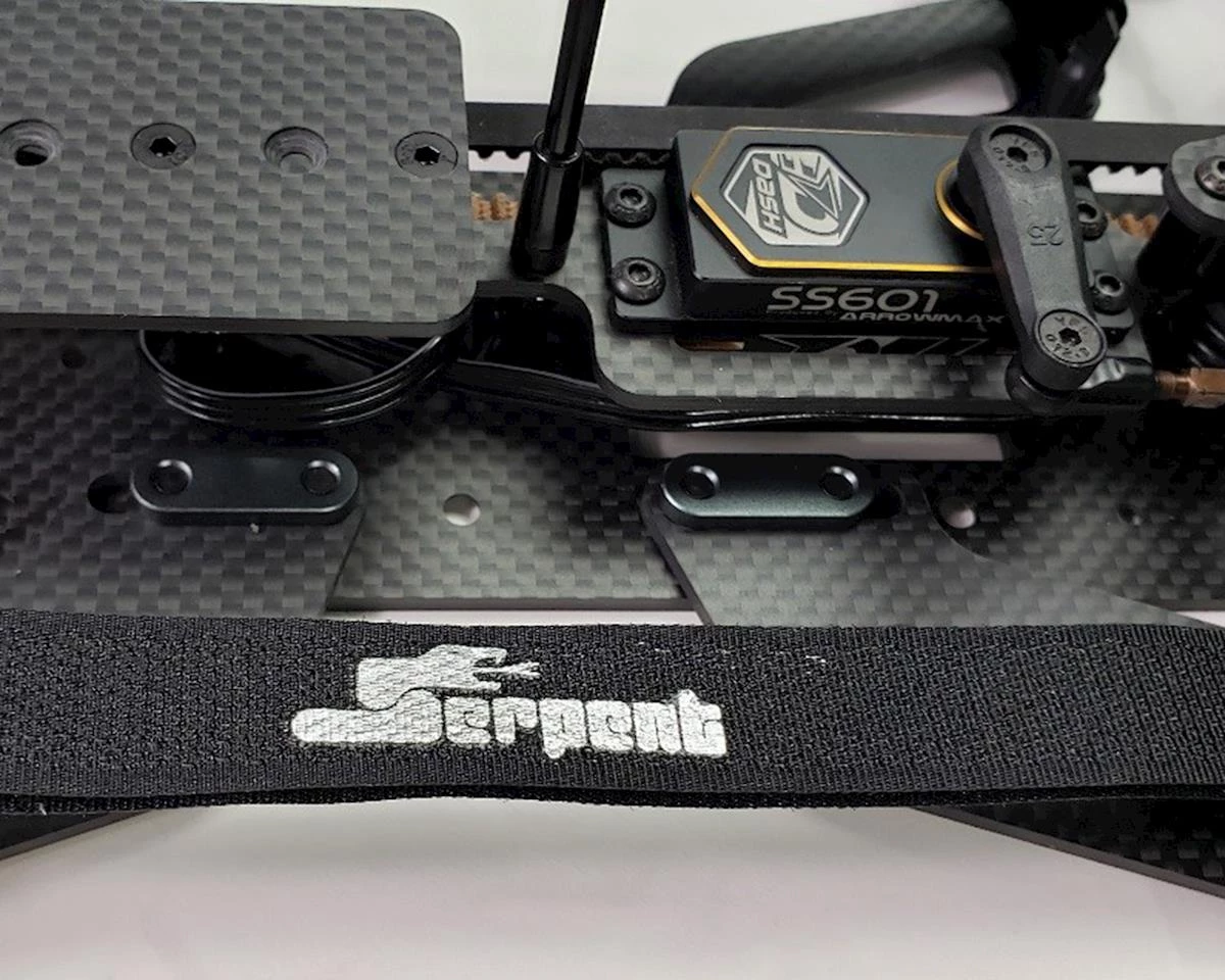 The narrow solid rear axle in Serpent spring steel has a lightweight 9mm wide 48T pulley. The axle has a double slot for the driveshaft pin for lightness and long life. Spring steel, CVD type, drive shafts connect the rear shaft to spring steel wheel-axles with aluminium quick change levers. A very durable and long lasting drivetrain.